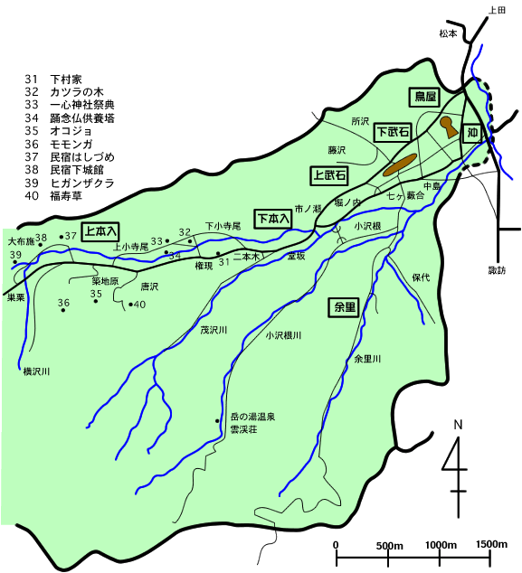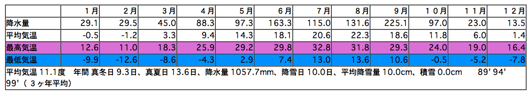 平均気温 11.1度 年間 真冬日 9.3日、真夏日 13.6日 降水量 1057.7mm、降雪日 10.0日、平均降雪量 10.0cm、積雪 0.0cm ( 1989,1994,1999年の3ヶ年平均) 集落と生活