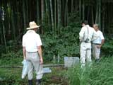 マツタケ山のテープ張りの班を決めるにじゃんけんで決め そちらに6人、後の8人は昨日の仕事の残った小豆の収穫と桃の木の下の空き袋片づけと草刈。 最後は全員でナシと桃のお土産取りを行う。山へ行った生徒は疲れたを連発。大学芋でお茶を飲み