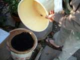 胡麻の選別=黒胡麻を水で不純物を沈殿させて実をざるに空ける